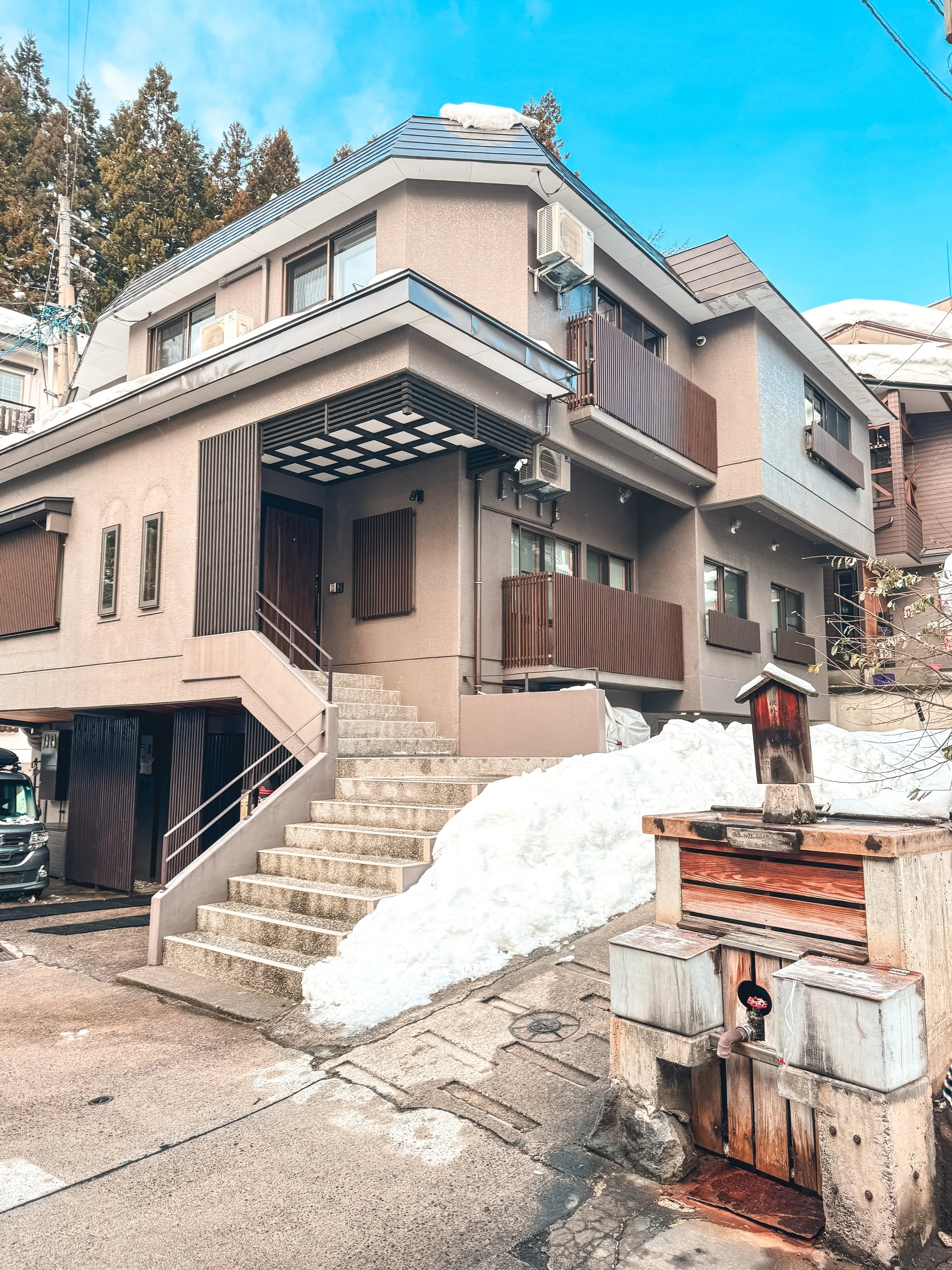 Kumanote Lodge is centrally located in Nozawa Onsen, a short walk from the Yu Road. With three apartment units, it’s perfect for big groups seeking comfort and convenience.